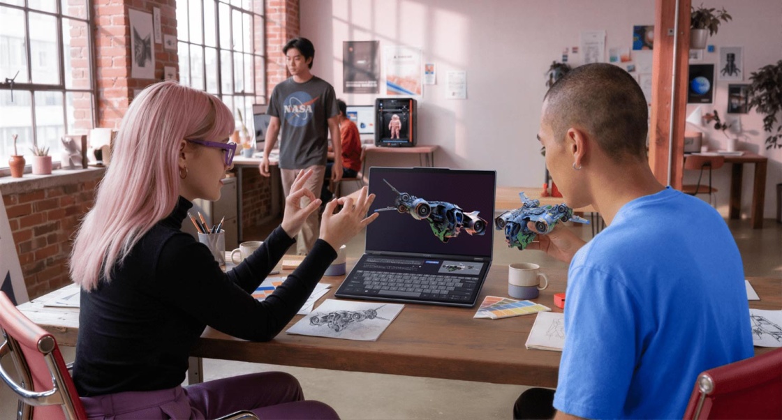 Концепт Yoga Book Pro 3D створений як відповідь на ці тенденції. Він дозволяє працювати безпосередньо у тривимірному середовищі без додаткового обладнання завдяки 3D-дисплею, що не вимагає окулярів, який природно передає глибину, форму та просторові взаємозв’язки. Ноутбук оснащений подвійними дисплеями Lenovo PureSight Pro Tandem OLED, які підтримують складні інтерфейси та детальні робочі процеси, пов'язані зі створенням 3D-контенту.