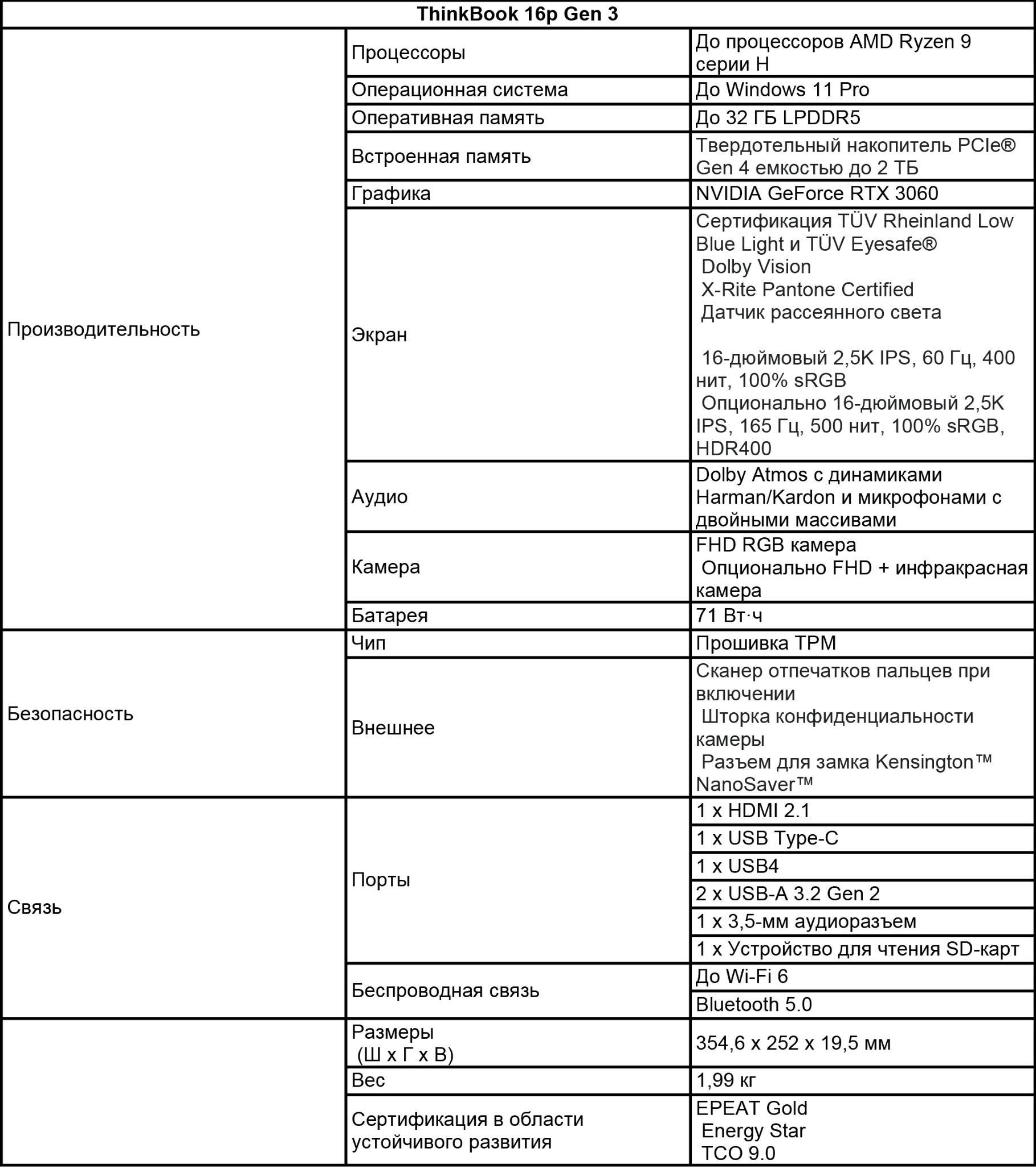 Новый Lenovo ThinkBook 16p Gen 3 поможет создателям контента и опытным пользователям раскрыть свой творческий потенциал полностью. Новейший ThinkBook с высокой производительностью оснащен процессором AMD Ryzen™ 9 6000 серии H и дискретной графикой NVIDIA GeForce® RTX™ 3060 для обеспечения впечатляющей продуктивности с Windows 11. Иммерсионные 16-дюймовые IPS-дисплеи с узкими рамками и разрешением 2,5K имеют сертификаты TÜV Rheinland Low Blue Light и TÜV Eyesafe®1 для максимального комфорта для зрения, и оснащены датчиком Ambient Light Sensor, который регулирует яркость подсветки экрана и клавиатуры. Доступны два варианта дисплеев, включая панель с яркостью 400 нит 60 Гц и новейшую панель HDR400 с яркостью 500 нит 165 Гц, сертифицированную VESA, которая позволяет насладиться яркими цветами с повышенной детализацией теней и бликов. Оба варианта дисплея также сертифицированы X-Rite Pantone® и поддерживают контент Dolby Vision®.